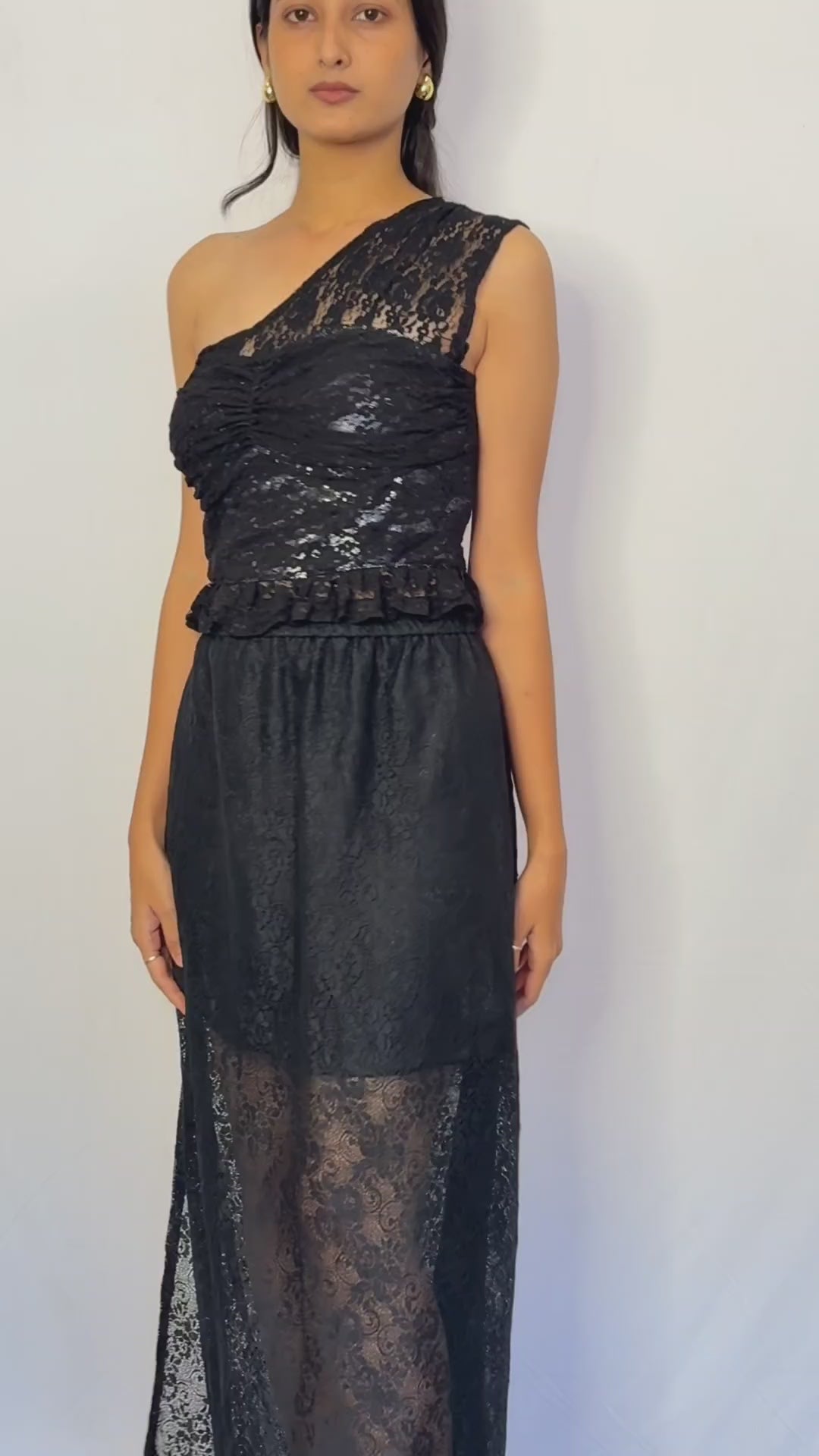 The Mid-Night Top is a one-shoulder lace and sequin crop top that perfectly balances glamour and grace. With ruched detailing and delicate lace trim, it’s a standout piece for special occasions or night-outs.